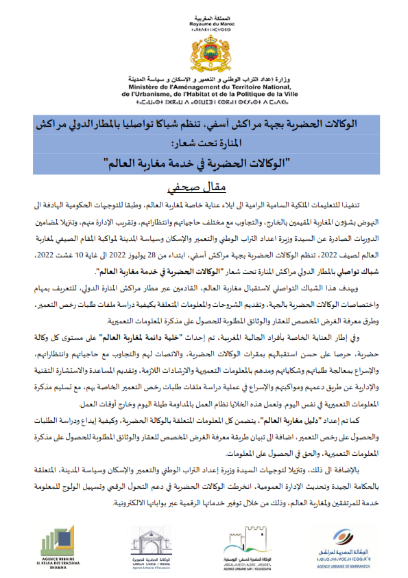 الوكالات الحضرية لجهة مراكش-آسفي تحدث شباك تواصلي لاستقبال المغاربة المقيمين بالخارج بالمطار الدولي المنارة ابتداءا من 28 يوليوز إلى غاية 10 غشت تحت شعار “الوكالات الحضرية في خدمة مغاربة العالم”