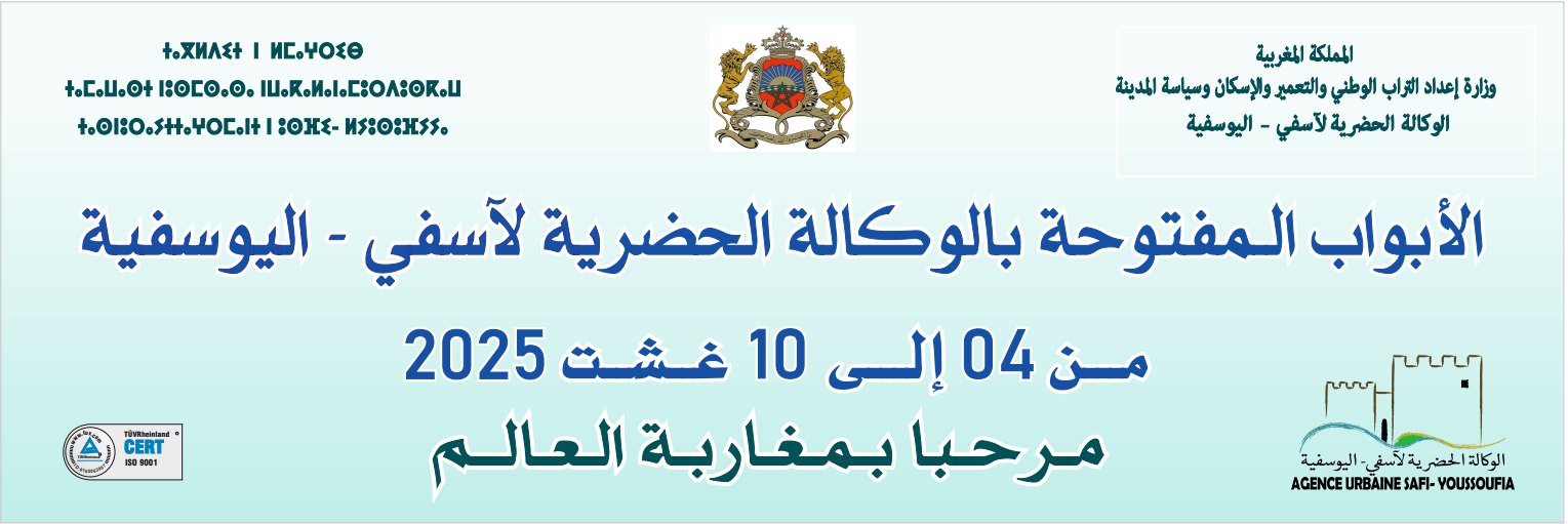 يتشرف السيد مدير الوكالة الحضرية لأسفي-اليوسفية بدعوة مغاربة العالم لحضور فعاليات أيام الأبواب المفتوحة المنظمة ما بين 04 و 10 غشت 2025 بمقر الوكالة الكائن بشارع إدريس الأول، عمارة حبابة، بلاطو المدينة الجديدة قصد التعرف على مهام الوكالة ومنجزاتها والمساطر المتبعة في مجال التعمير والتدبير الحضري وفرص الاستثمار والتعريف ببرنامج “الدعم المباشر للسكن”.